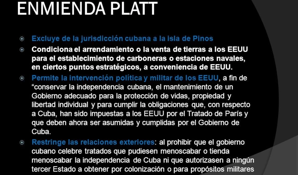 - 1901: Las fuerzas norteamericanas de ocupación hacen incluir en la Constitución de la nueva República de Cuba la Enmienda Platt, mediante la cual Estados Unidos se arrogaba el derecho de intervenir en los asuntos cubanos cada vez que estimara conveniente, lo cual volvió a hacer en 1906. Cuba también fue forzada al arrendamiento de varios puntos del territorio nacional, entre ellos el ocupado por la Base Naval de Guantánamo.