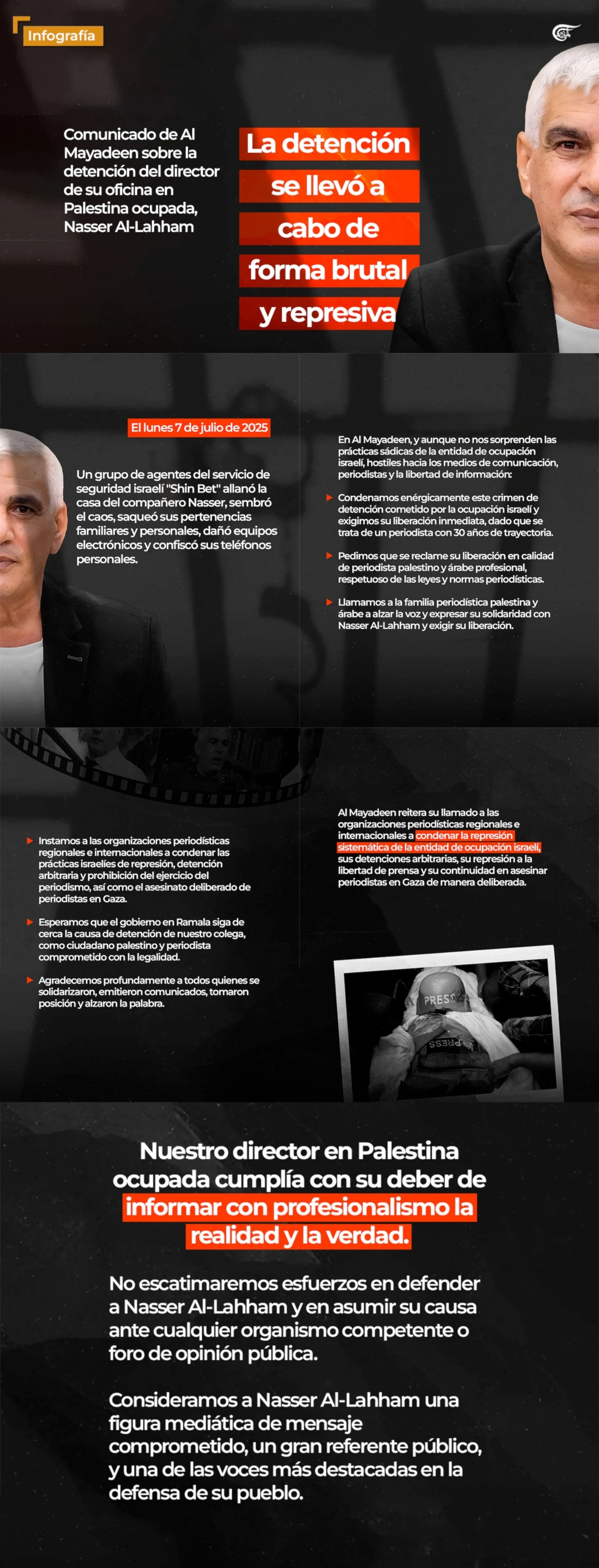 La red Al Mayadeen condena el crimen cometido por la ocupación al arrestar al director de su oficina, el periodista Nasser Al-Lahham. Hace un llamado a la prensa palestina y árabe para que alce la voz y exprese su solidaridad, exigiendo su liberación.