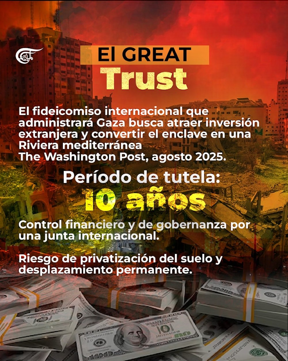 El documento oficial del Great Trust publicado por The Washington Post explica que la financiación cubre todos los aspectos, incluyendo “10 megaproyectos de construcción, asistencia humanitaria, desarrollo económico, generosos paquetes de reubicación voluntaria y seguridad de primer nivel. Este plan no depende de donaciones.”